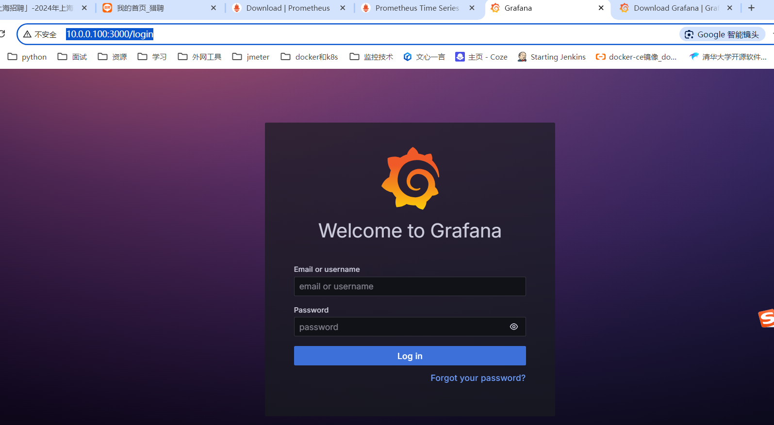 浏览器访问地址 http://10.0.0.100:3000/login (这里ip地址使用实际安装grafana的ip),登陆grafana,默认用户名:admin;密码:admin