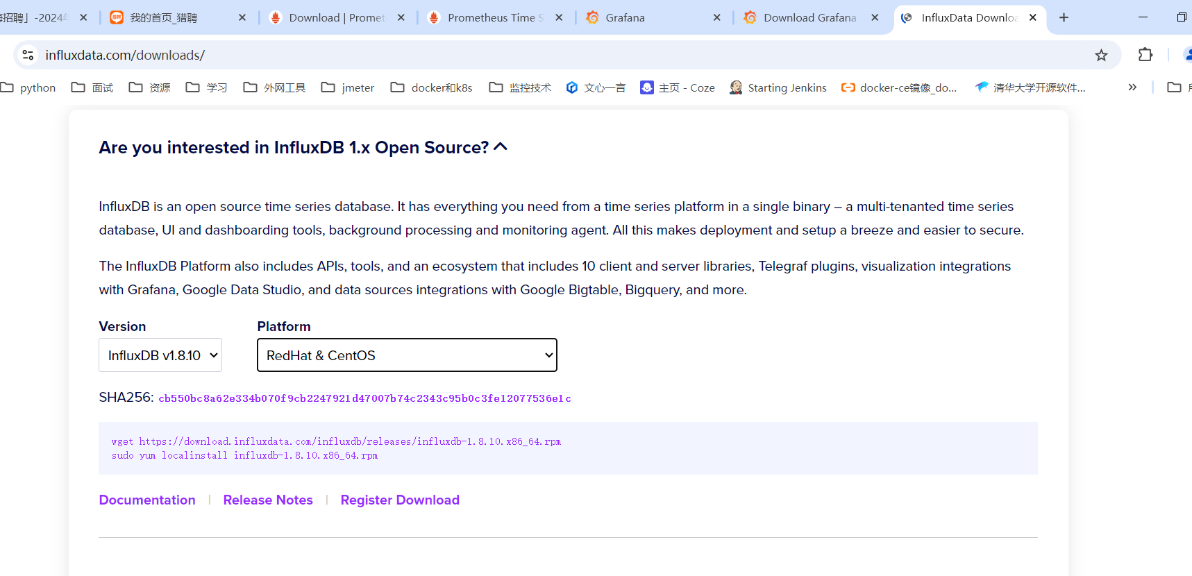 官网下载地址:https://www.influxdata.com/downloads/ 这里我们需要的是1.X系列的版本,安装时选择1.8.10 的最新版本 系统我们选择Centos的安装方式