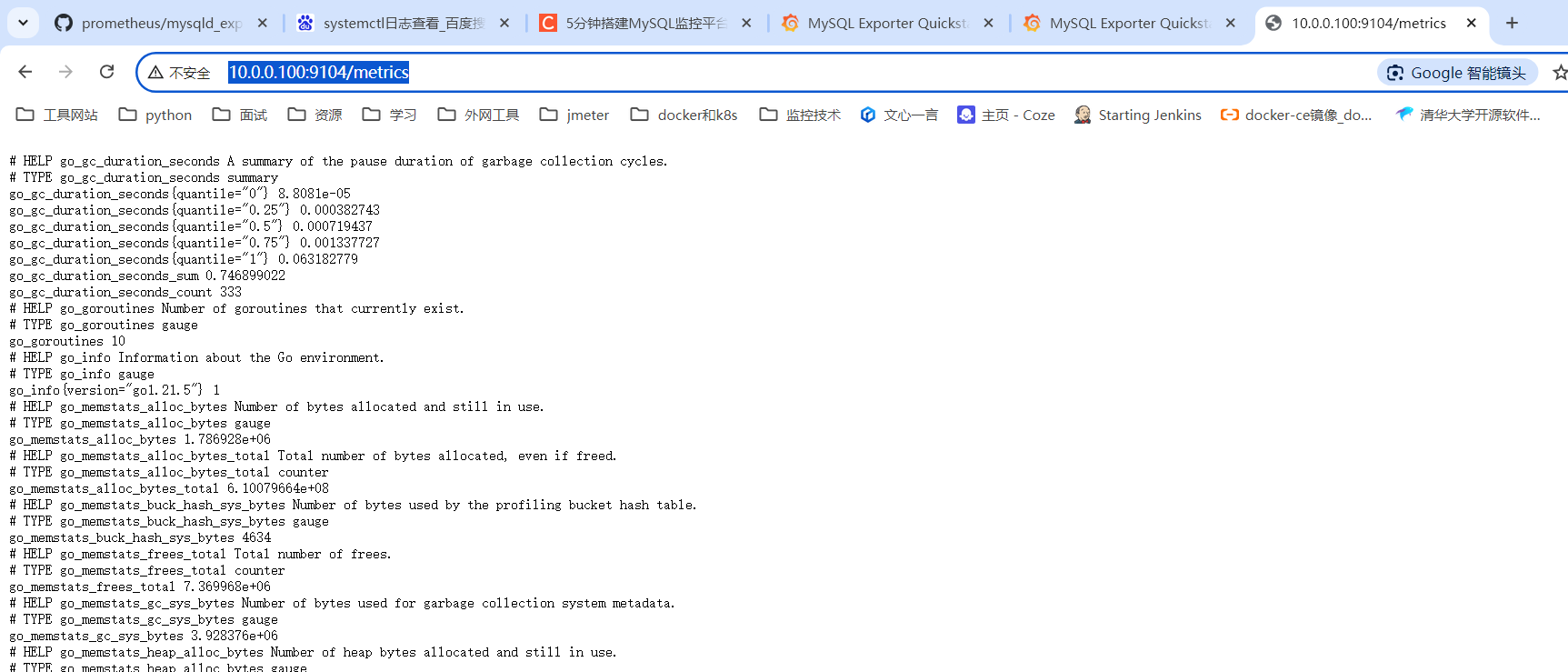 浏览器访问地址 http://10.0.0.100:9104/metrics 界面可以看到如下界面,mysqld_exporter采集数据成功