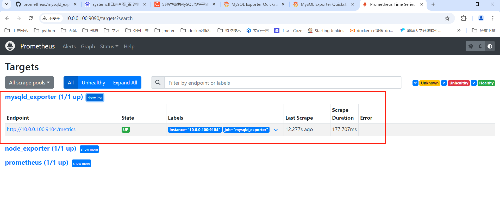 通过浏览器地址访问 http://10.0.0.100:9090 的地址访问(ip地址使用实际的地址),在Status->Targets 下 看到 mysqld_exporter启动成功的记录