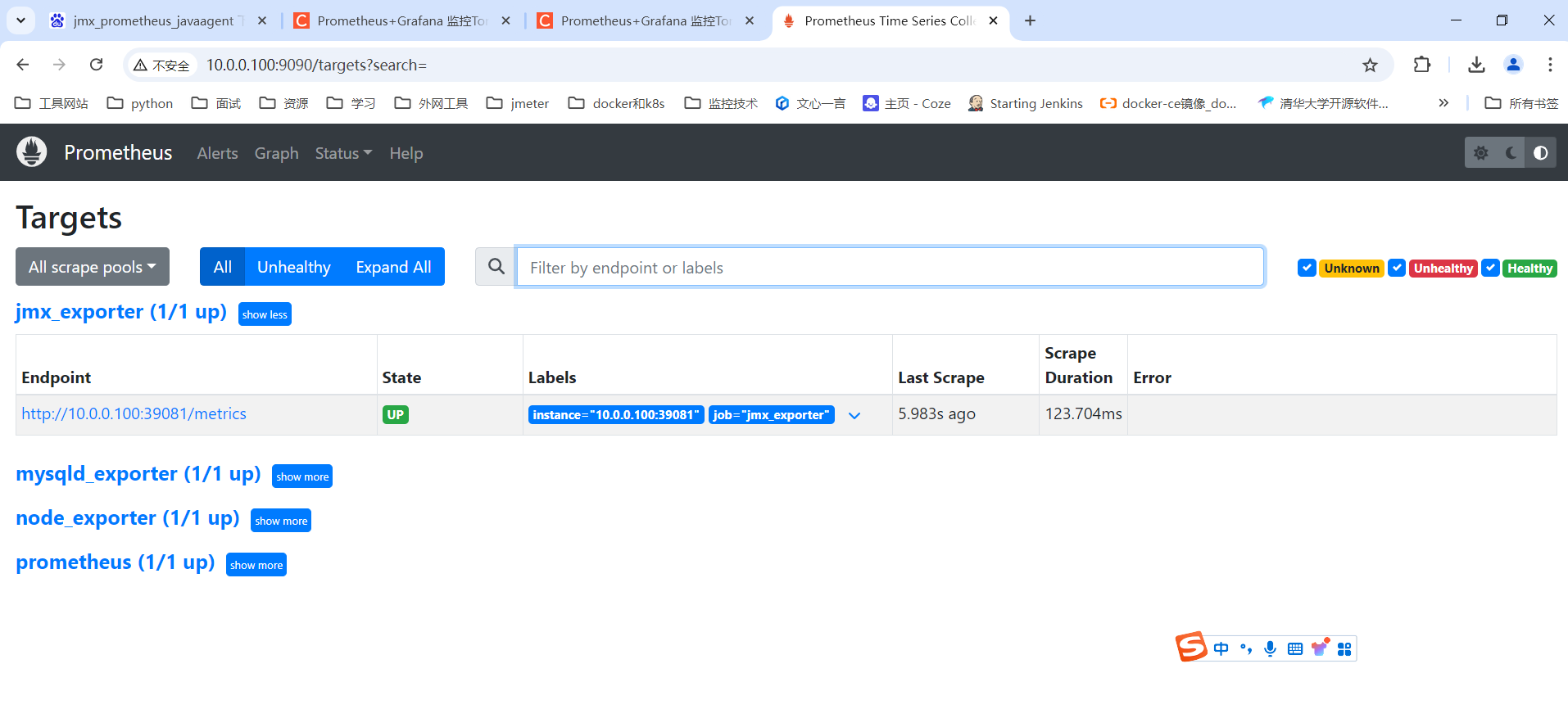 通过浏览器地址访问 http://10.0.0.100:9090 的地址访问(ip地址使用实际的地址),在Status->Targets 下 看到 jmx_exporter启动成功的记录