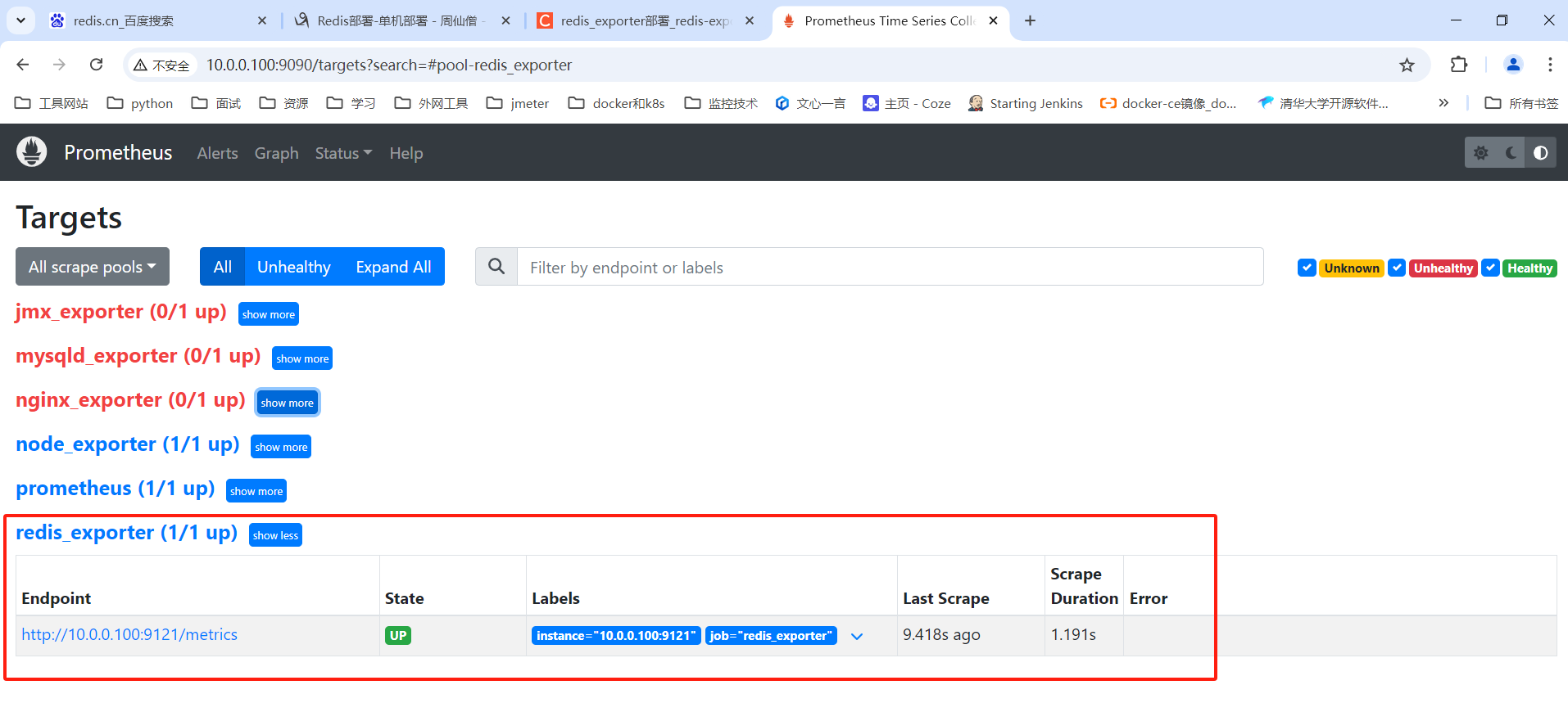 通过浏览器地址访问 http://10.0.0.100:9090 的地址访问(ip地址使用实际的地址),在Status->Targets 下 看到 redis_exporter启动成功的记录