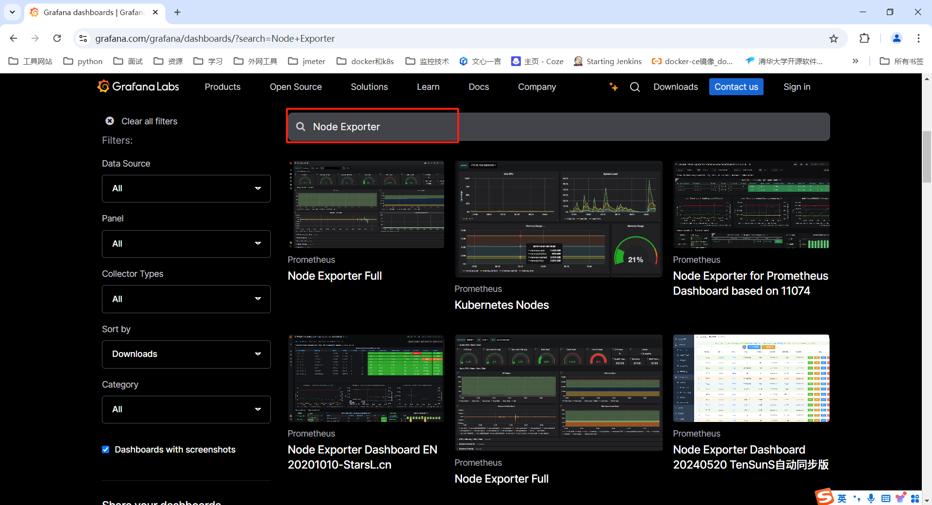 在搜索栏中输入Node Exporter 数据采集的数据模版,可以看到有很多的模版,注意模版上描述的支持的数据源,我们需要选择prometheus数据源的模版