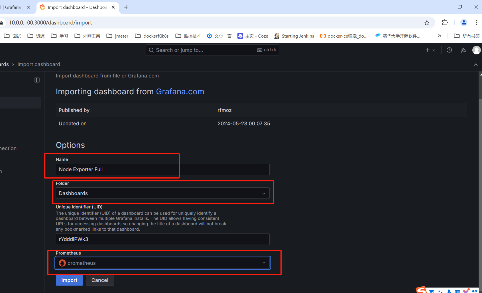 在grafana机器可以访问的网络的情况下,我们粘贴对应的官方模版的ID后,可以直接生成模版