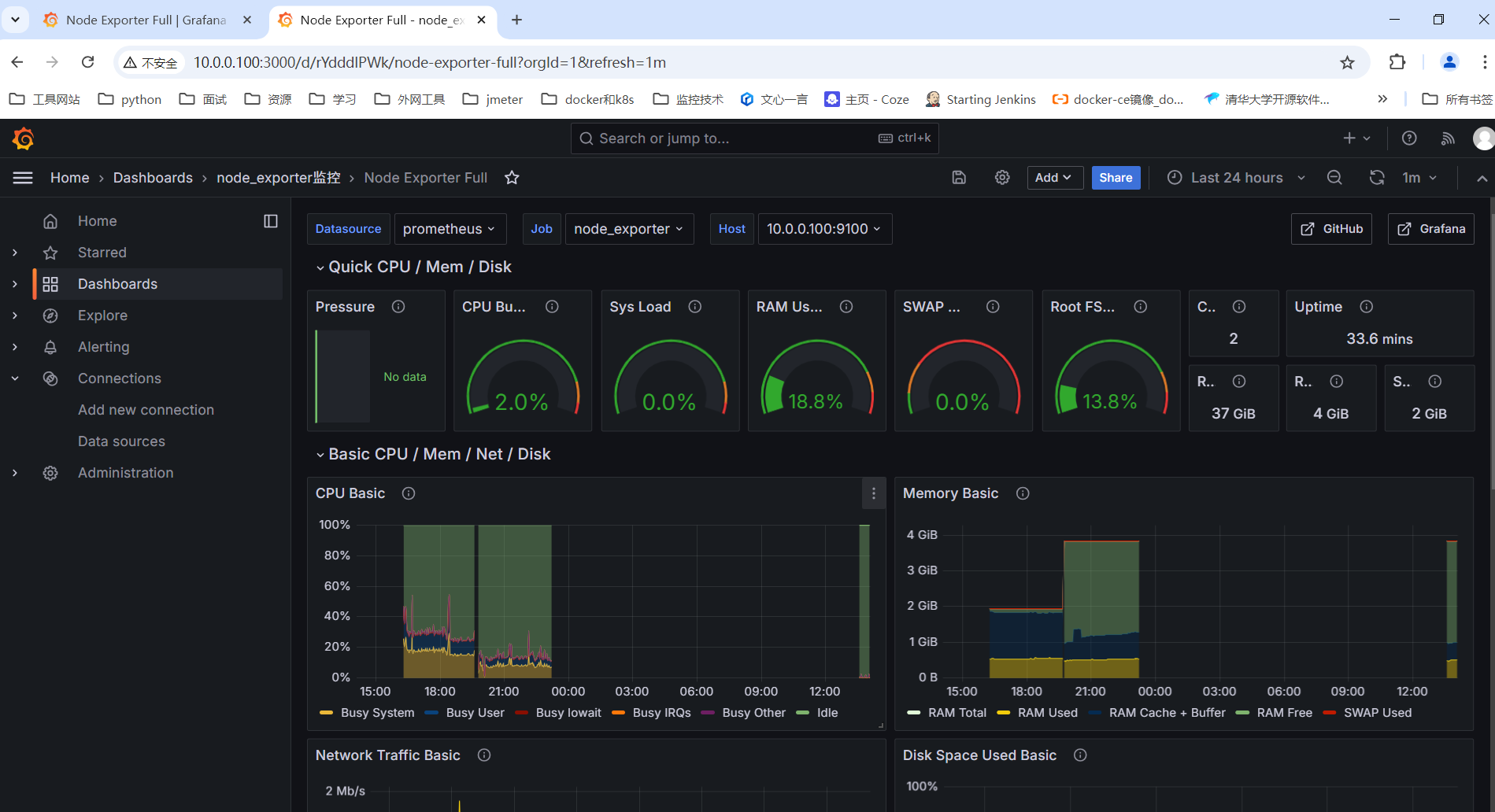 生成后可以在Dashboards中看到我们的内容,可以看到通过prometheus采集的linux的数据在模版展示