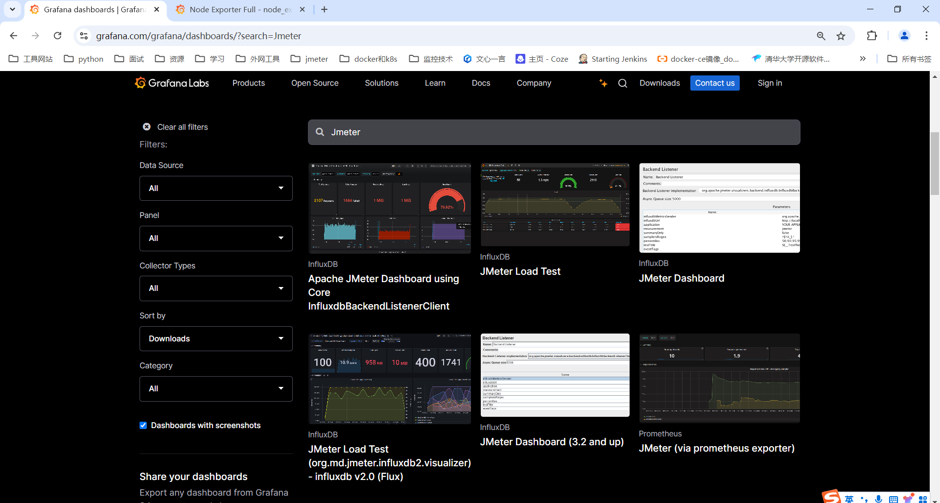 在搜索栏中输入Jmeter数据采集的数据模版,可以看到有很多的模版,我们Jmeter数据采集使用的是influxdb的数据源,因此我们需要选择一个influxdb数据源的模版