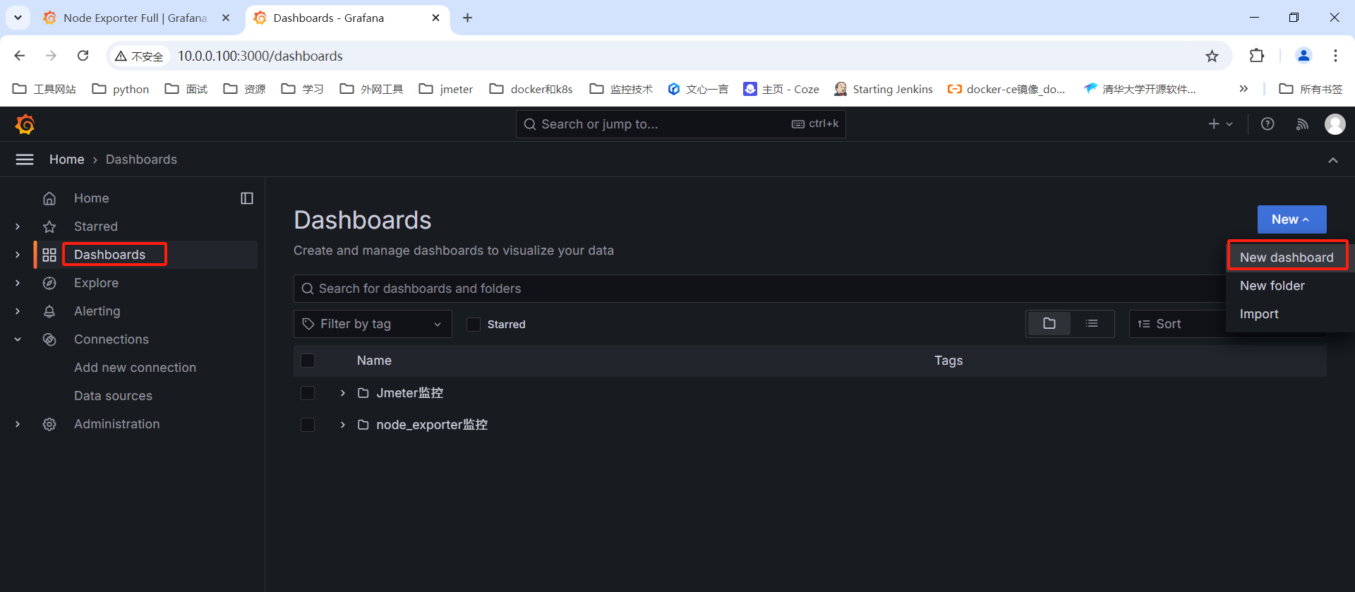 浏览器打开grafana的环境,点击Dashboards -> NEW -> New dashboard