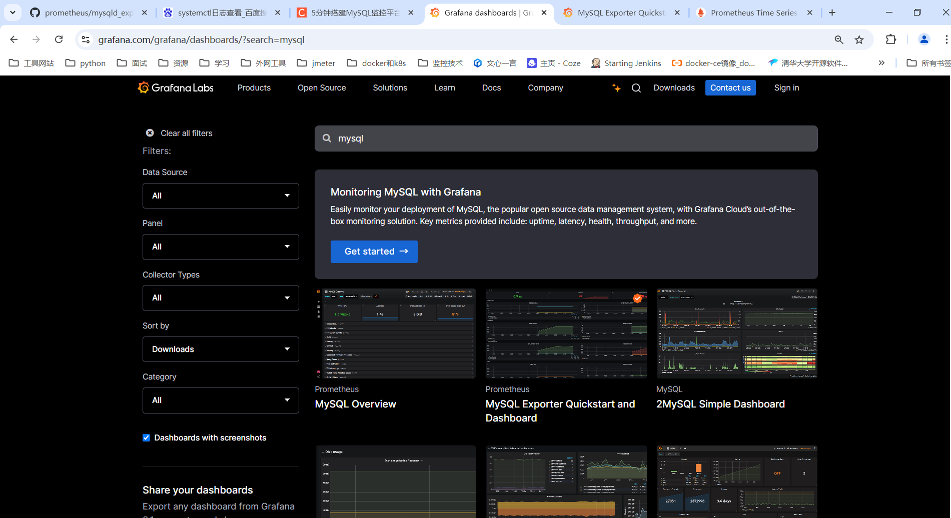 在搜索栏中输入mysql 数据采集的数据模版,可以看到有很多的模版,注意模版上描述的支持的数据源,我们需要选择prometheus数据源的模版