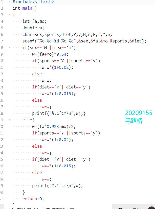 数据表达 int faHeight,moHeight; double w char sex,sports,diet,Y,y,N,n,F,f,M,m;