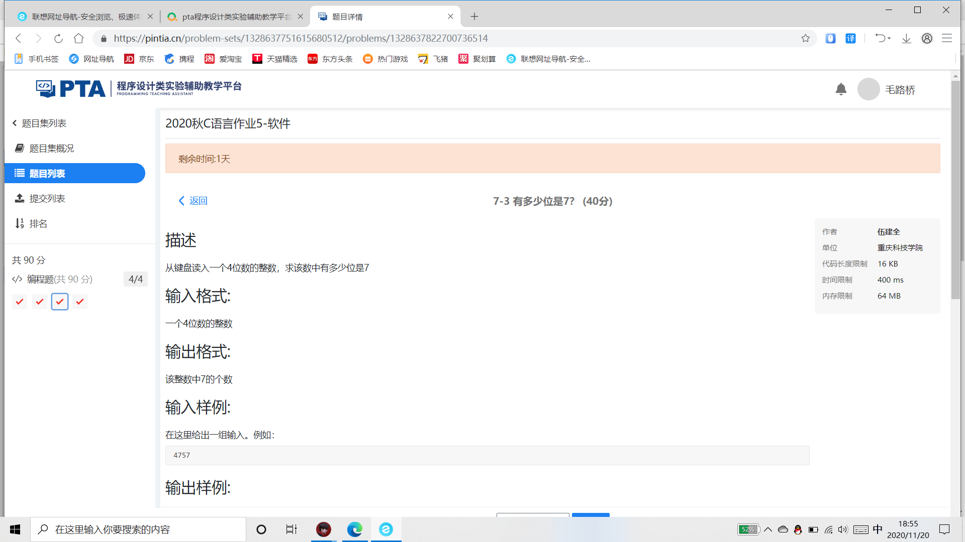 从PTA题目集中选出2个你最满意的题目完成以下内容,选择题目难度越大,分值越高,每题20分(每项5分),内容要求如下: