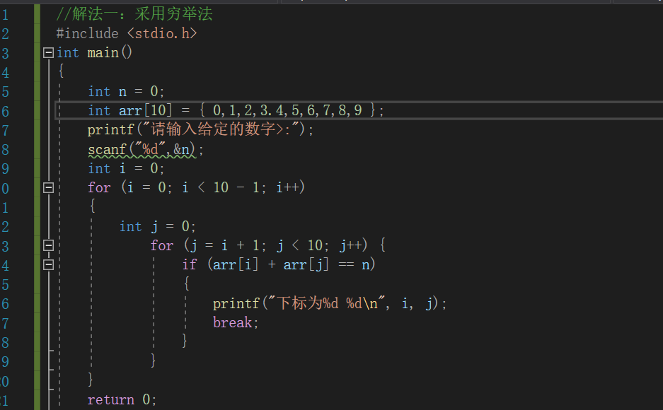 解法一:采用穷举法,从数组中任意取出两个数字,计算两者之和是否为给定的数字。