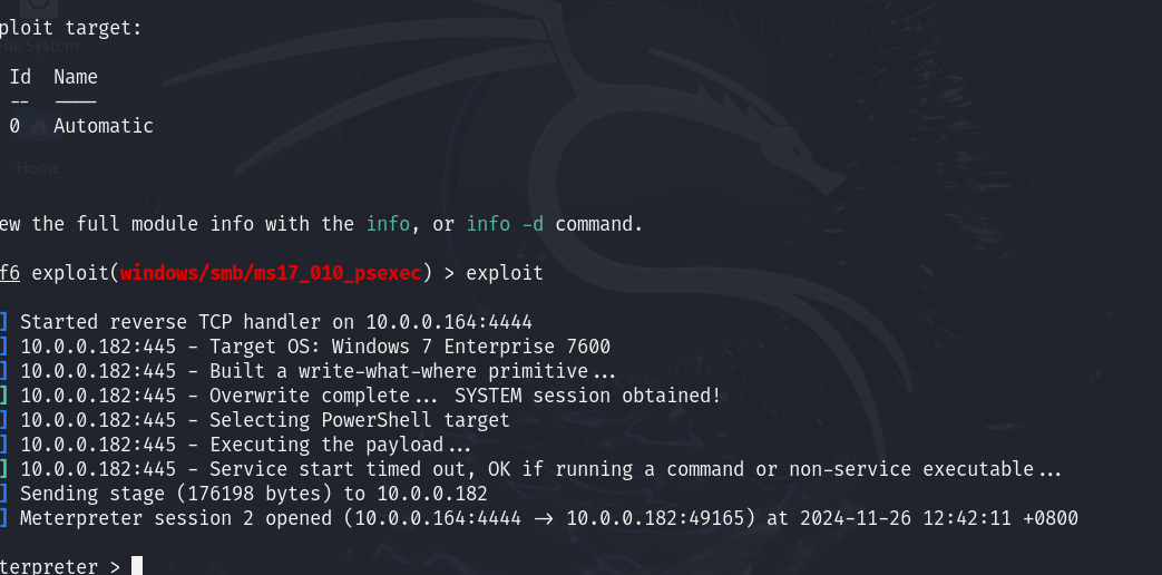 Use0模块需要关闭防火墙允许smb流量的出入,其余不用配置,攻击效果拿下shell