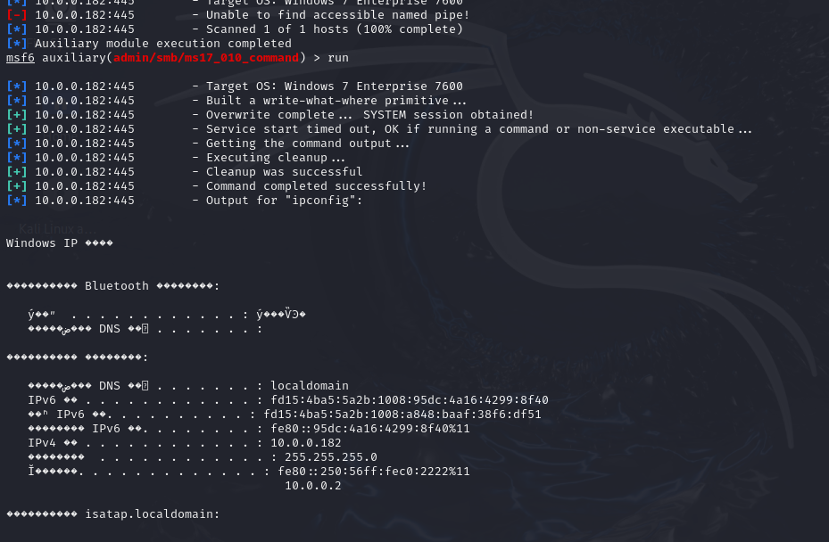 Use2模块需要关闭防火墙smb流量的出入,以及目标必须允许匿名IPC$和管道名,攻击效果信息收集,可以执行相关命令