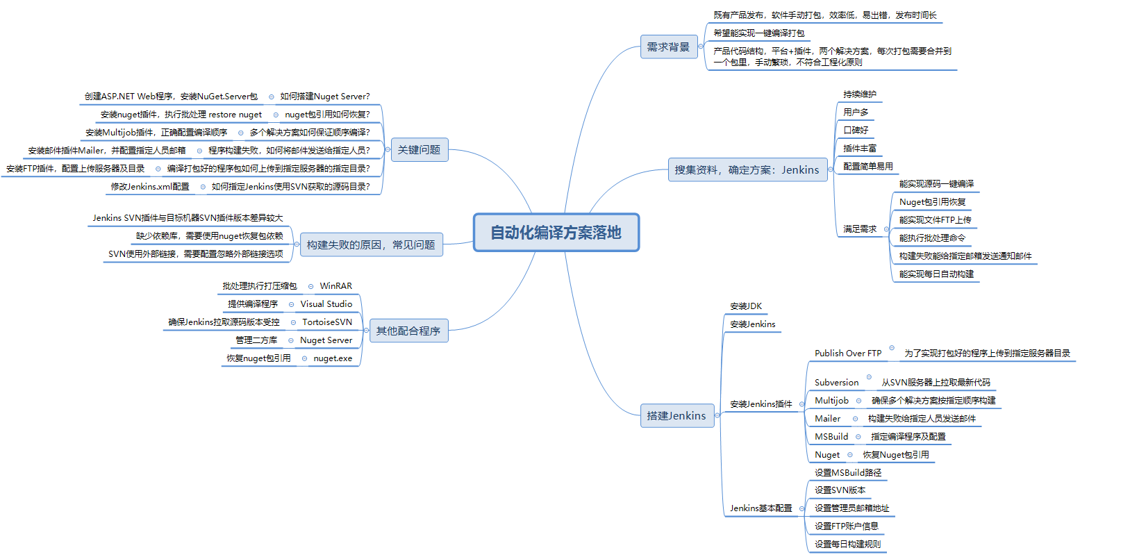 笔者所在产品组使用Jenkins自动编译打包程序已经有一段时间了,从萌生搭建一套自动化编译方案,到最终确定使用Jenkins,使用中遇到的各种问题,以及不断增加的新需求及解决办法做一个全面总结,具体内容如下: