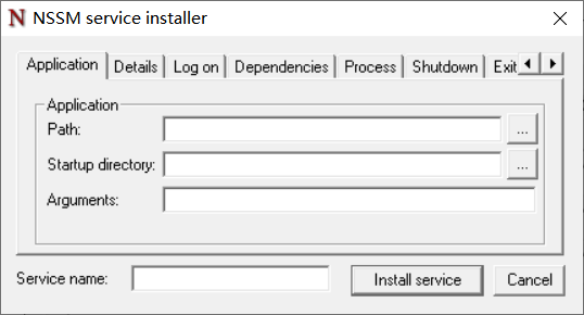 (1)nssm使用命令行才能查看主界面:在命令行窗口中定位到nssm.exe根目录,执行nssm install,显示如下: