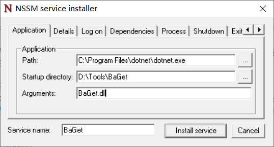 (3)点击按钮Install service,执行成功后在服务中可以查看到BaGet服务已安装
