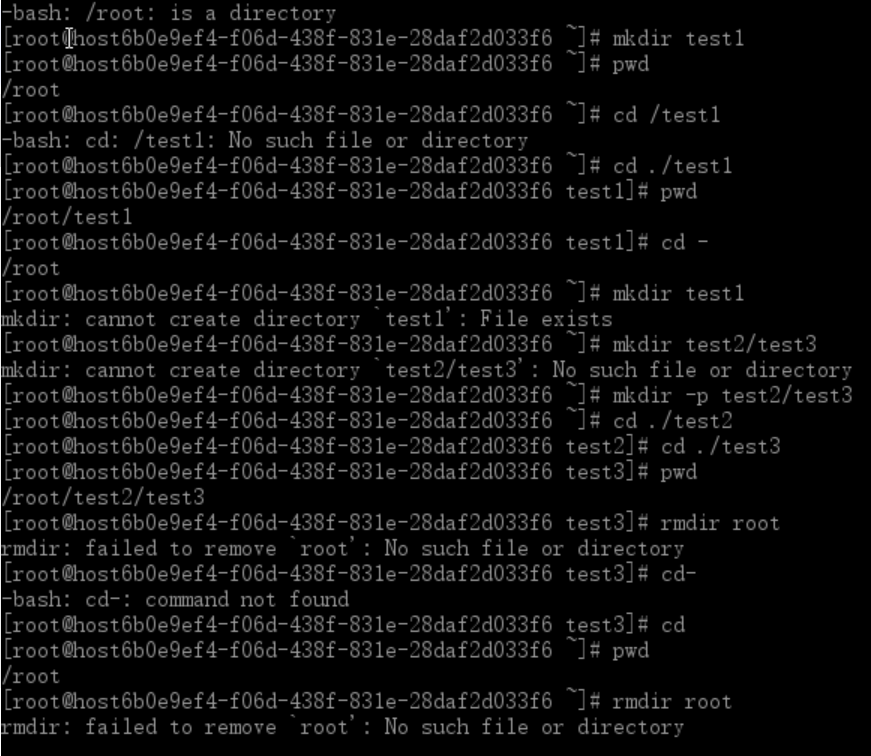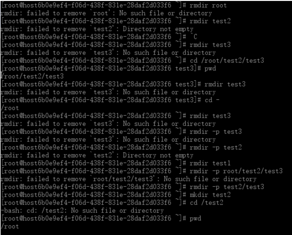 4.目录删除命令rmdir 即为remove directory 用法与创建目录类似为:rmdir [-p] 目录名称,其中-p表示连同上层“空的”目录也一起删除,当我们想要删除刚刚创建的目录test2时,如果单纯的使用 rmdir test2命令则会提示”not empty“错误,所以需要使用-p来递归删除 即使用命令 rmdir -p test2/test3