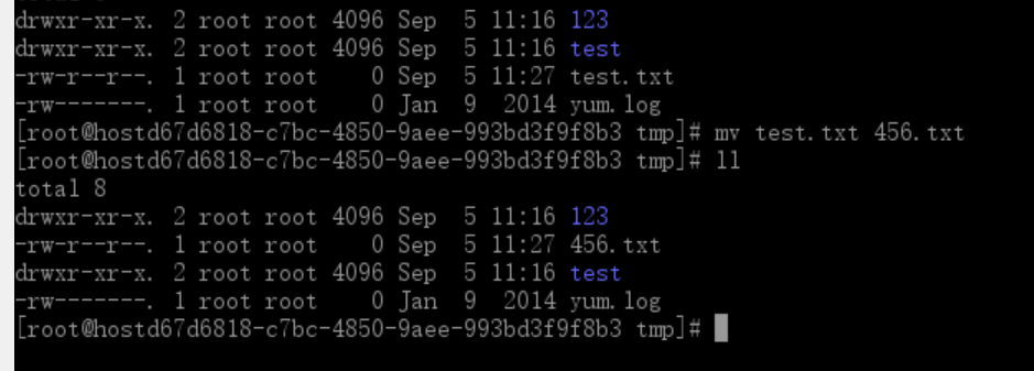 mv之重命名;利用命令mv test.txt 456.txt可以将已经创建好的文件test.txt重新命名为456.txt