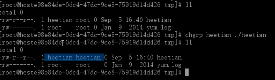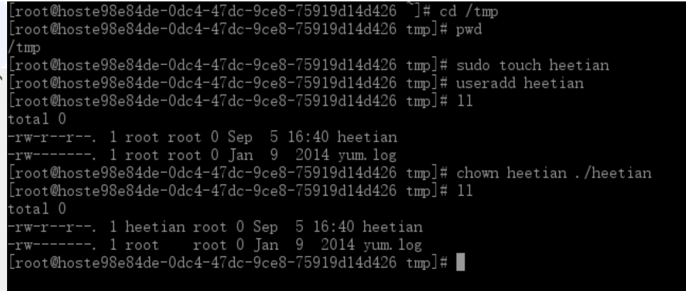 更改 /tmp/heetian.txt 的用户组和用户名所有者 都为 root