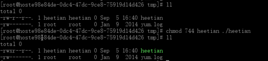 在使用了命令:chmod 744 heetian ./heetian之后成功的将原来的权限数字644改为了744