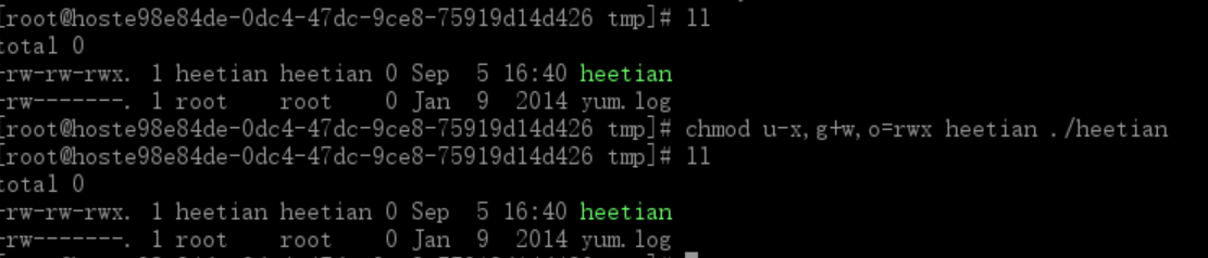 例如执行命令chmod u-x,g+w,orwx heetian ./heetian便可使权限发生以下改变