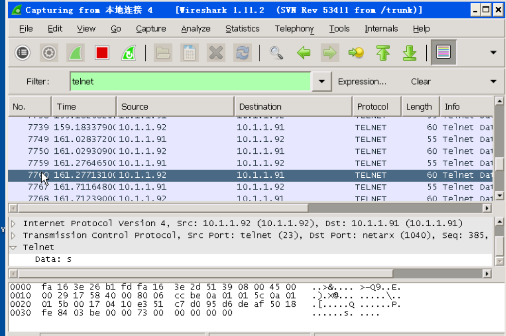 通过wireshark抓包后,传统Telnet会话所传输的资料并未加密,帐号和密码等敏感资料容易会被窃听,而且telnet时单个字符传输