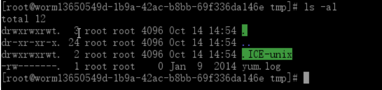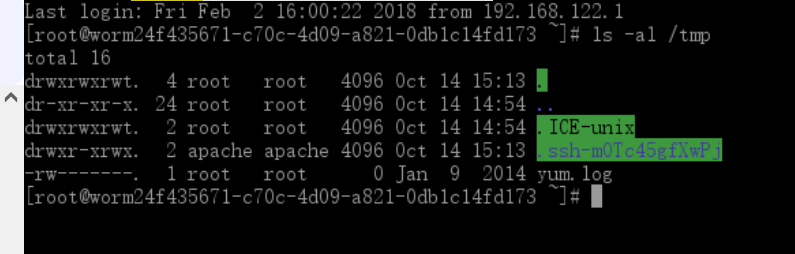 2.经过一段时间之后(大约10分钟),登录Worm2。同样使用命令:”ls -al /tmp”查看,可以发现主机也被此蠕虫感染。对比效果如下图: