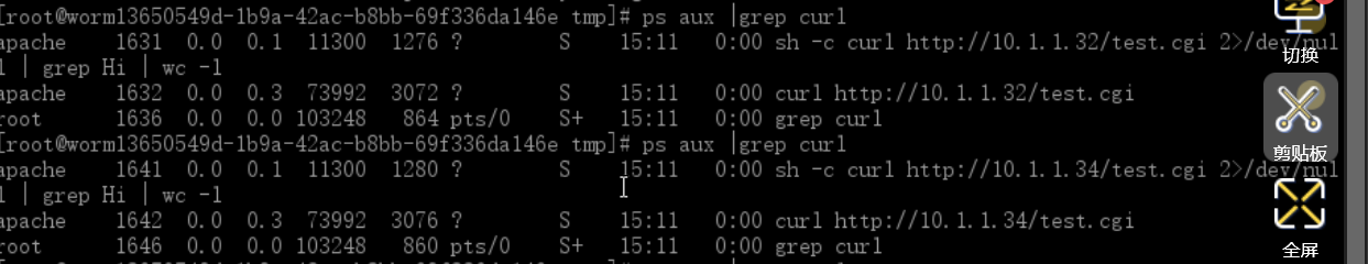 1.登录Worm1(10.1.1.12),不断的执行命令:“ps aux |grep curl”可以看到蠕虫的传播过程,被感染的Worm1通过agent.1337进程,不断的向同网段的其他主机发起攻击与感染。如下所示: