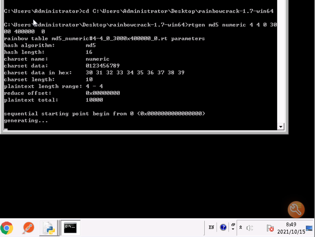 2.以攻击者的视角,通过生成相应的彩虹表来对4位数字密码MD5密文进行破解。