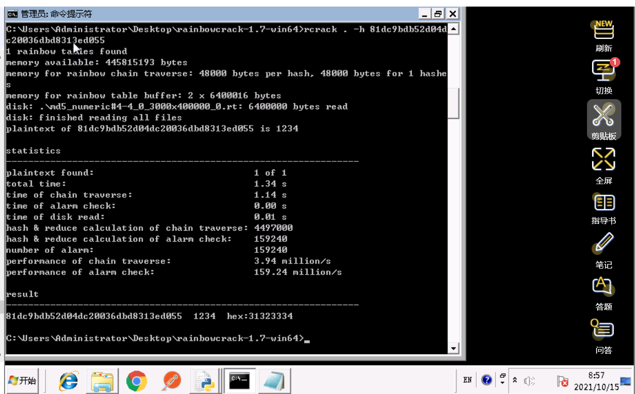 3)对我们实验一中的md5密文进行彩虹表破解: