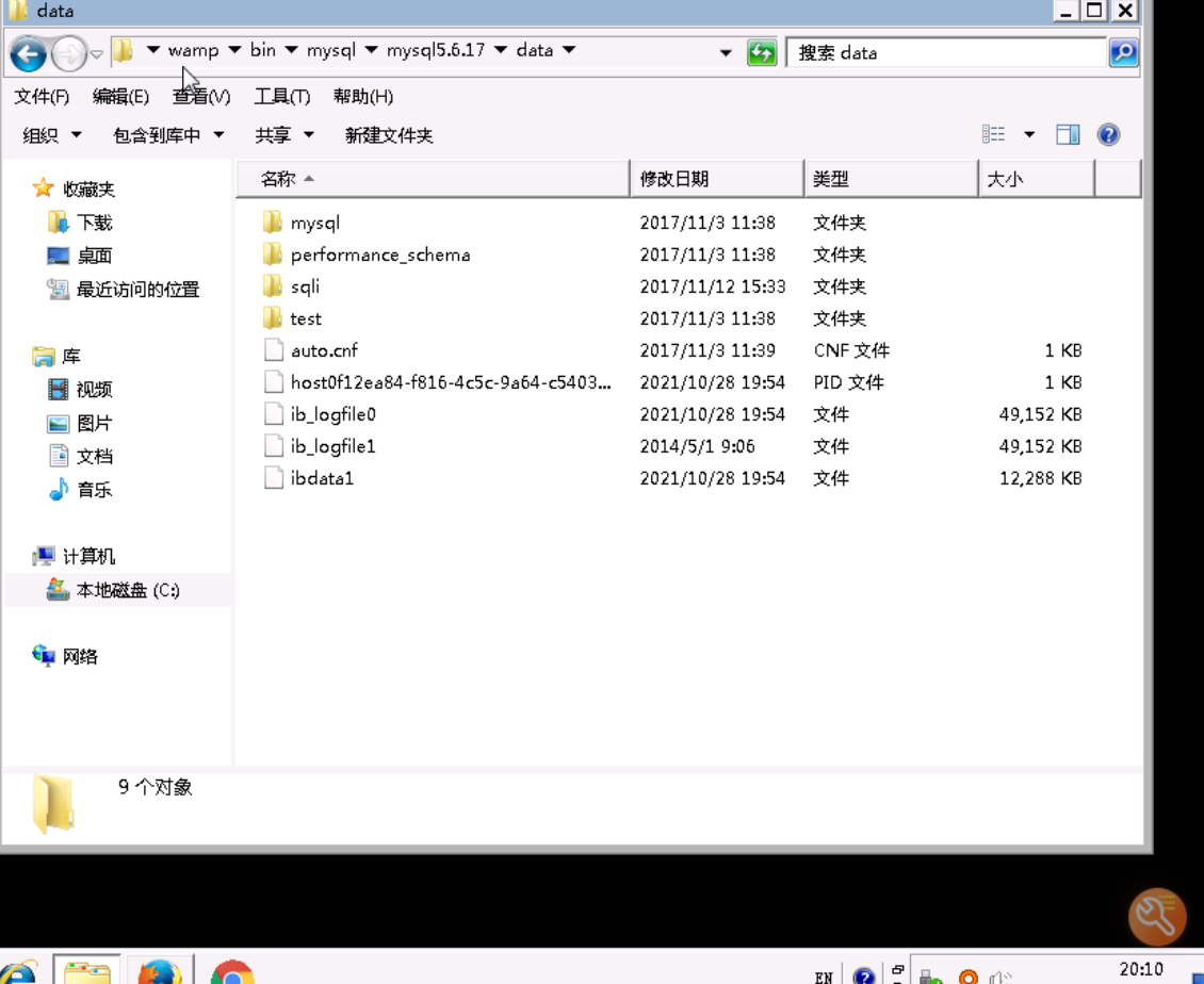 这上面显示的表,它们实际上是视图,而不是基本表,所以你在数据库的数据保存目录,会看不到这个数据库的实体文件。数据库的数据保存在 C:\wamp\bin\mysql\mysql5.6.17\data 目录,在这个目录下一共有如下4个目录: