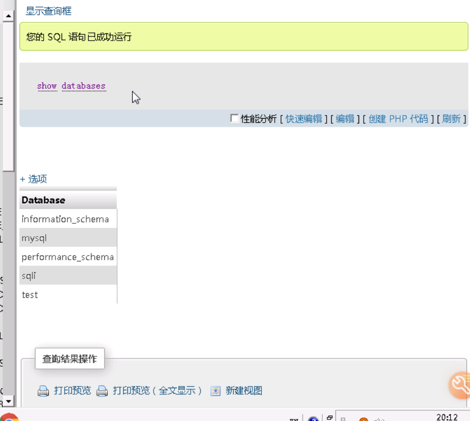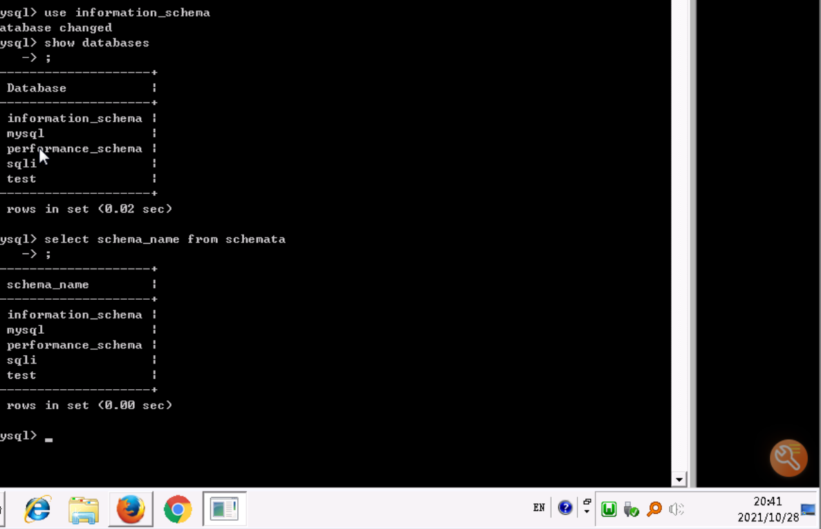 需要注意的是,要在information_schema这个数据库中执行该SQL语句。如何进入information_schema数据库执行SQL语句,请参考前面进入sqli数据库执行SQL语句的步骤。