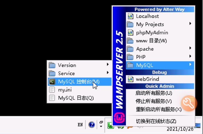 点击右下角的wampserver图标,如果没有该图标,可以双击桌面的WampServer运行。
