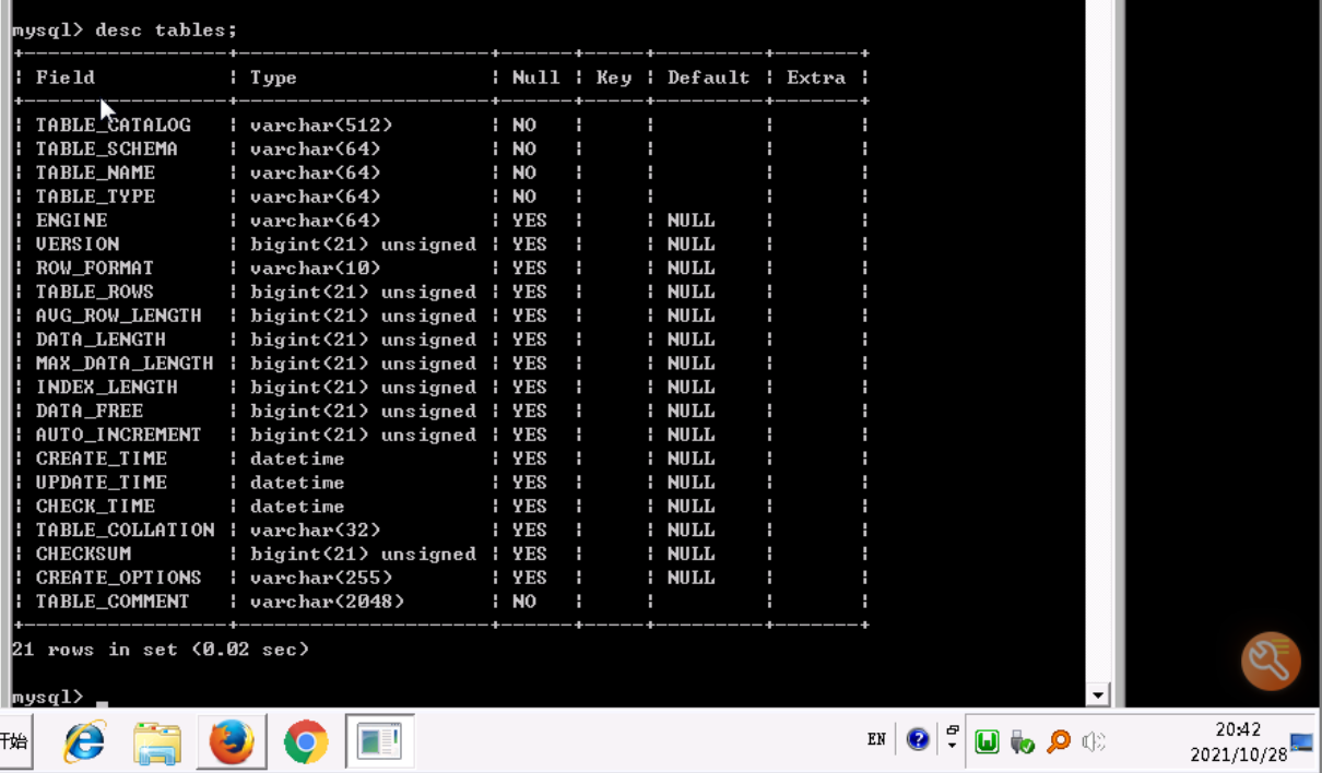 desc 可以用来看表结构。看下tables的表结构,执行desc tables;,结果如下图: