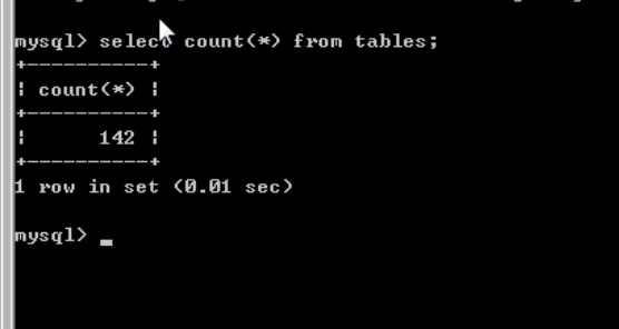 注意上图中标记的那2条记录,每一条记录中,他们分别记录一个表名和一个这个表所属的库名。其中TABLE_NAME保存的是表名,而TABLE_SCHEMA保存的是这个表名所在的数据库。我们可以查询一条记录看看,在查询前,先看看有多少条记录,避免记录太多查看不方便,执行select count(*) from tables; 结果如下图: