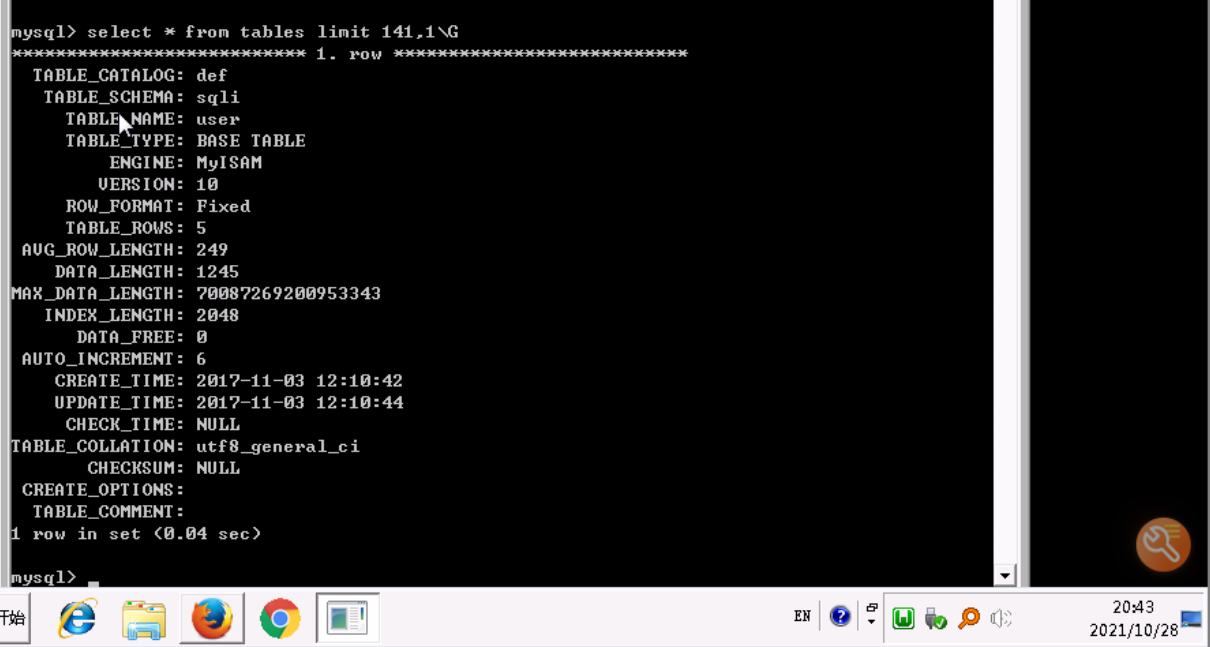 说明当前所有数据库中的表数量为142。查询任意一条记录查看,我这里选择最后一条记录,SQL语句为:select * from tables limit 141,1\G由于在客户端中,默认查询结果显示不友好,所以,可以把语句后面的分号改成\G,他会让一条记录显示一行,看起来不那么乱。\G只支持在客户端中用,在其他连接数据库的软件中,使用\G会报错。