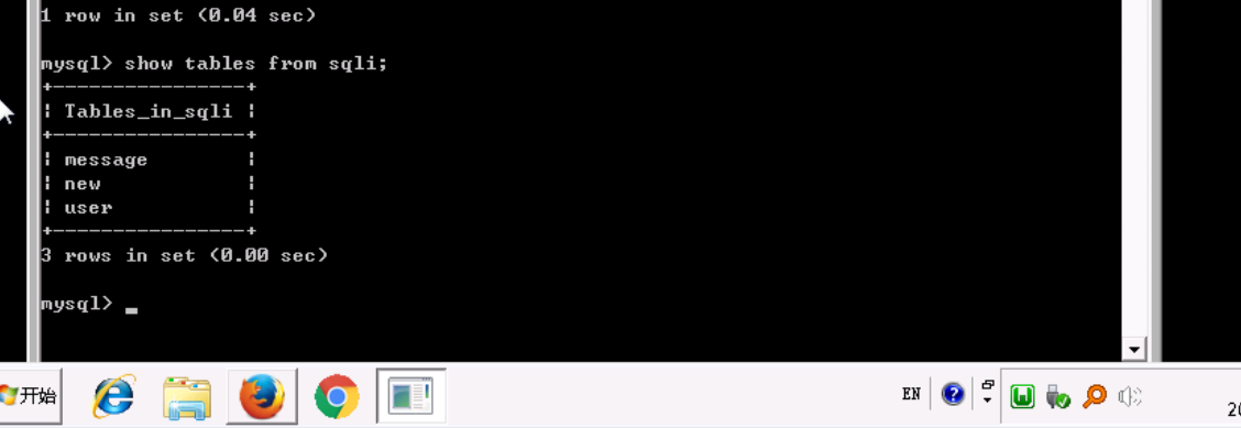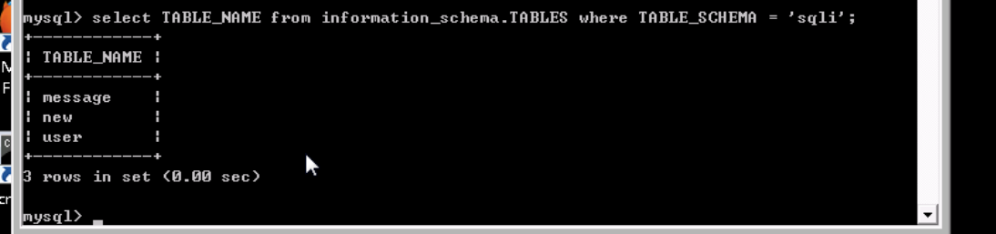 可以看到,最后一条记录的TABLE_NAME是user,TABLE_SCHEMA为sqli。查看sqli数据库中的表,SQL语句为:show tables from sqli;可以看到确实存在user表。
