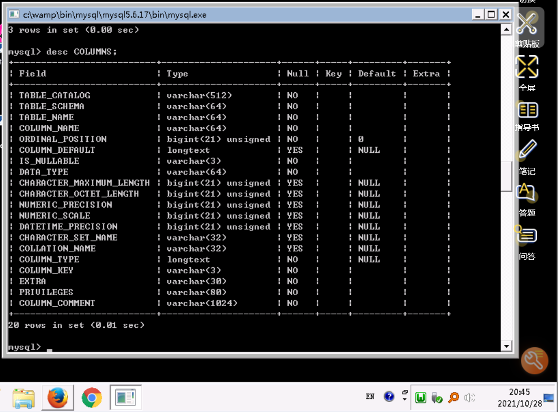 幸运的是,在information_schema数据库中,同样存在一个表,它保存了整个数据中,所有的列名,这个表就是COLUMNS。同样先查看该表结构。