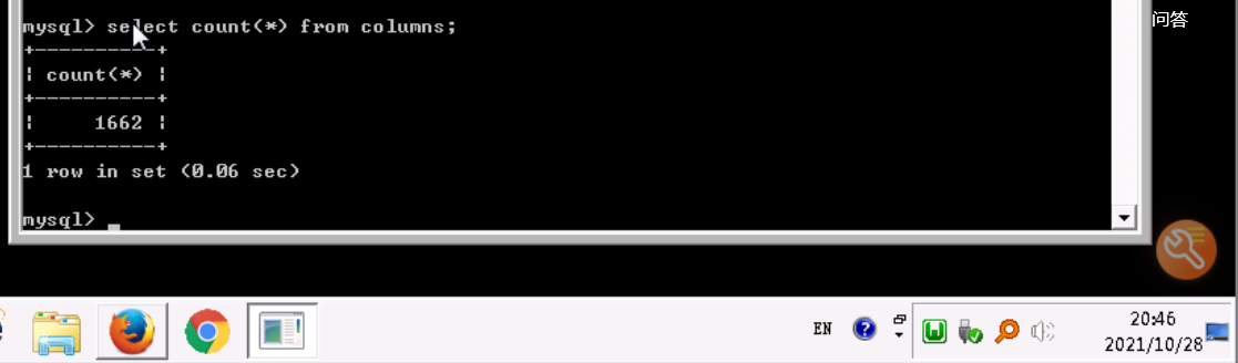 这里面,与注入相关的存在3个字段,分别是TABLE_SCHEMA、TABLE_NAME以及COLUMN_NAME,不难猜到,如果在该表中查询一条记录,TABLE_SCHEMA保存了这条记录保存的字段所属的数据库名,而TABLE_NAME保存的是该字段所属表名,COLUMN_NAME则是一个列名记录,查询一条记录验证一下,首先确定该表有多少条记录,执行select count(*) from columns;,得知一共有1662条记录,结果如下图: