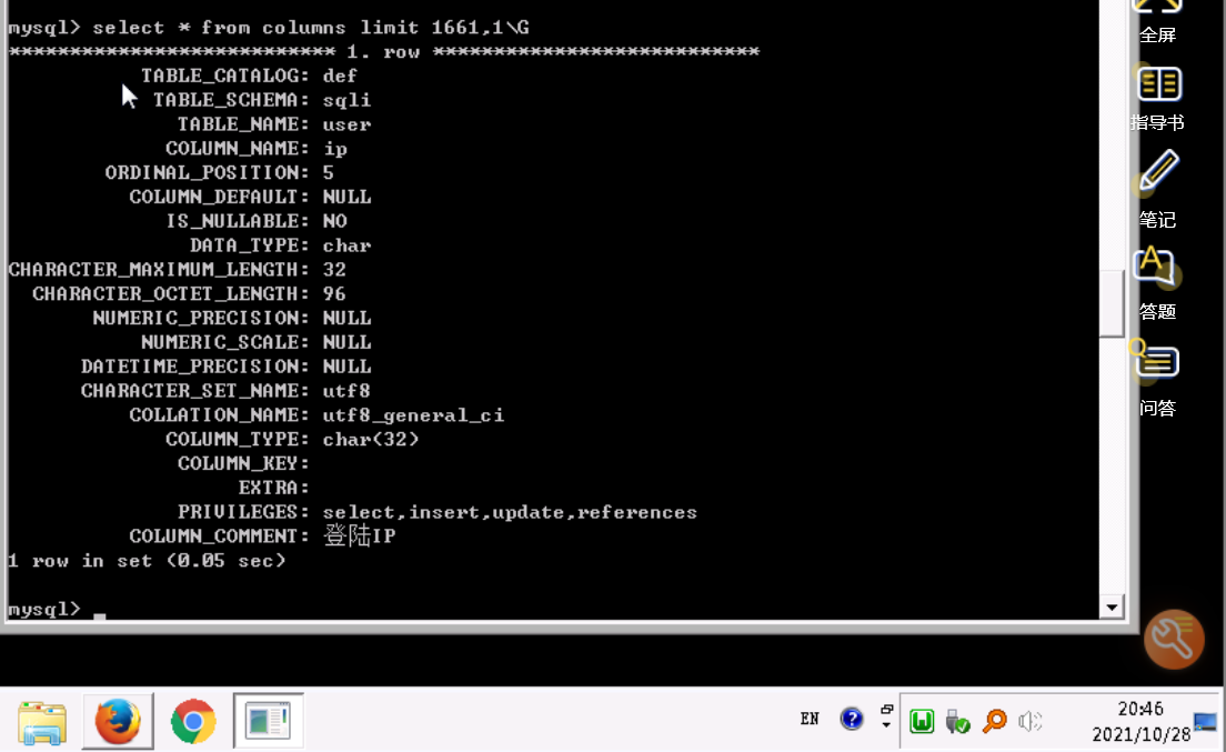 我们获取最后一条记录,执行select * from columns limit 1661,1\G