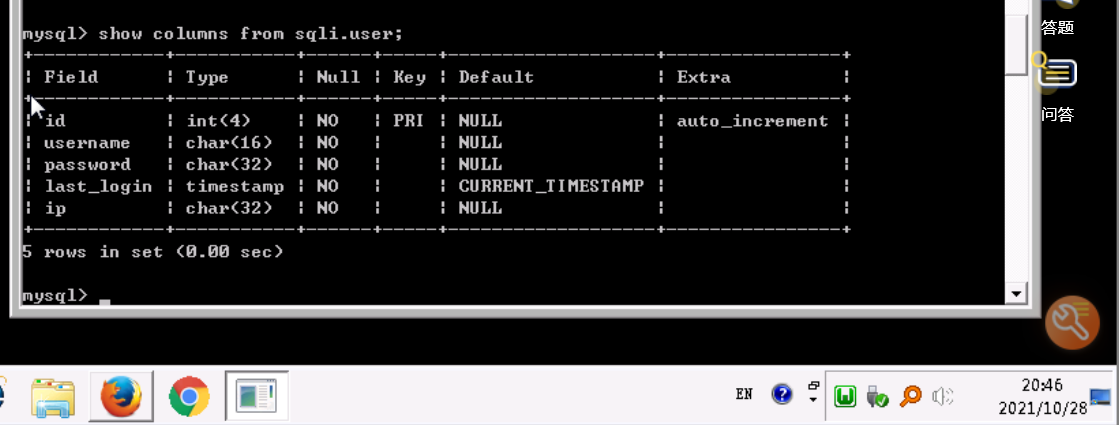 查看sqli的user表是否存在该字段,执行SQL语句:show columns from sqli.user;