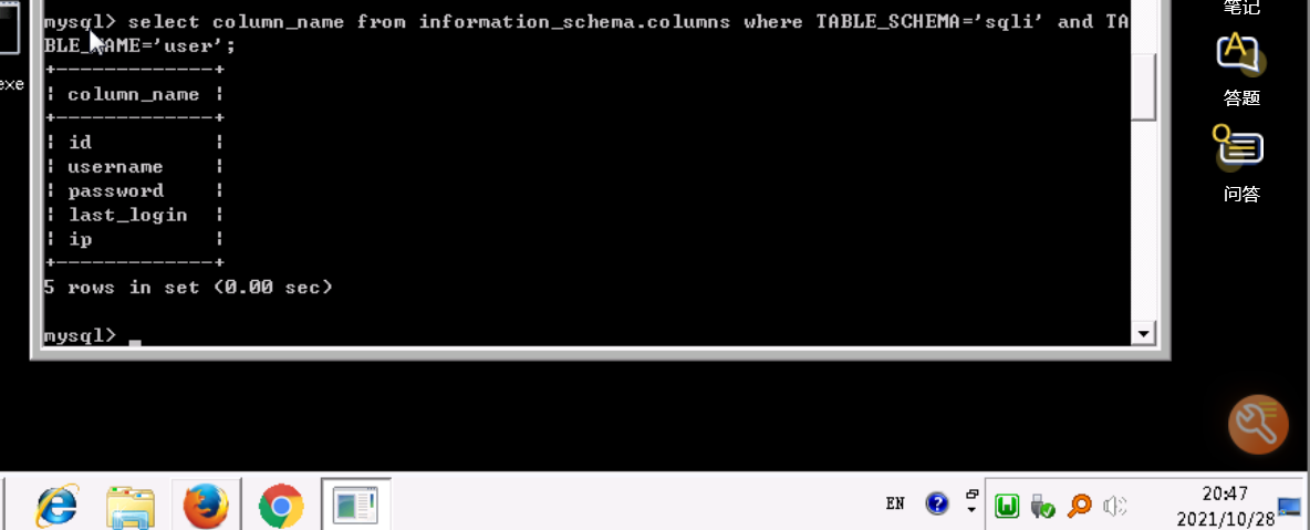 其中COLUMNS_NAME为ip,TABLE_NAME为user,TABLE_SCHEMA为sqli,这说明,在sqli这个数据中,user表存在一个ip的列,也就是我们常说的ip字段。