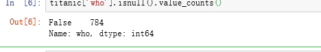 # 统计空值的个数 titanic['who'].isnull().value_counts()