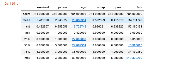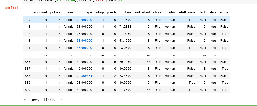 # 将异常值替换为平均值 titanic.replace([512.329200],titanic['fare'].mean())