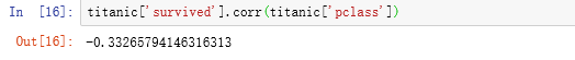 5.使用corr()函数,判断两个属性是否具有相关性,分析舱位的高低和存活率的关系