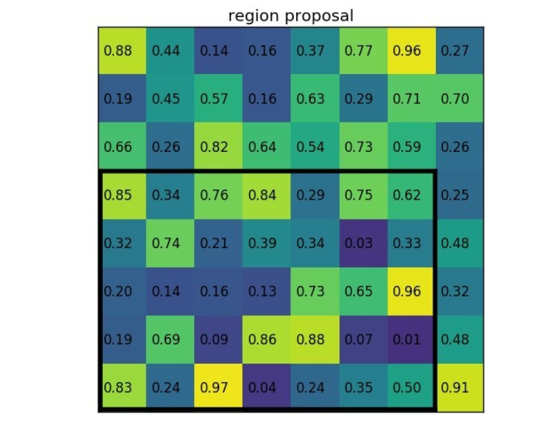 ROI pooling总共有两个输入,分别是backbone和RPN输出,这个分别代表着backbone提取的特征图和这个特征图中可能含有目标物体的候选框,而ROI pooling的操作是首先将这些候选框画在backbone提取的特征图上,之后再将特征图上候选框的区域提取出来,换句话说如上图所示,黑色框包围的就是候选框所涵盖的特征图,将黑色框包围的特征图提取出来,在经过max pooling操作,这样能够使得对于不同大小的候选框经过pooling之后输出是相同大小的特征图,最后将所有候选框对应特征图pooling之后的特征进行拼接在进行classification和regression