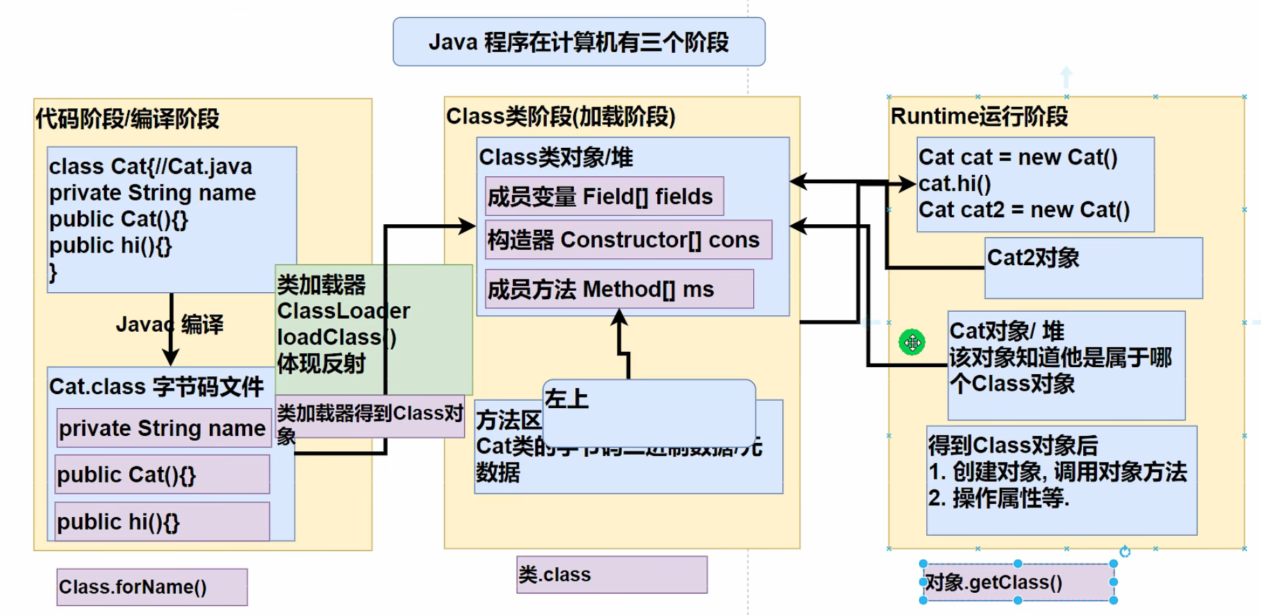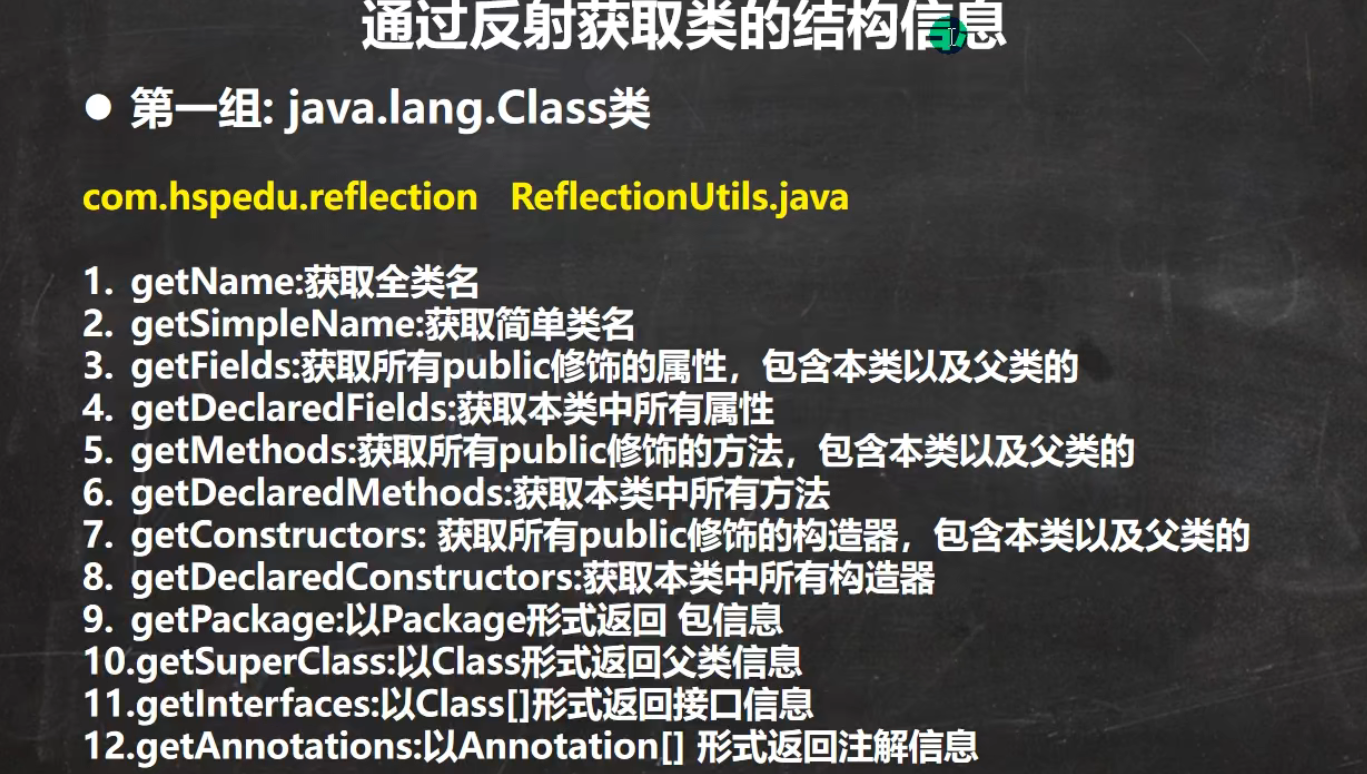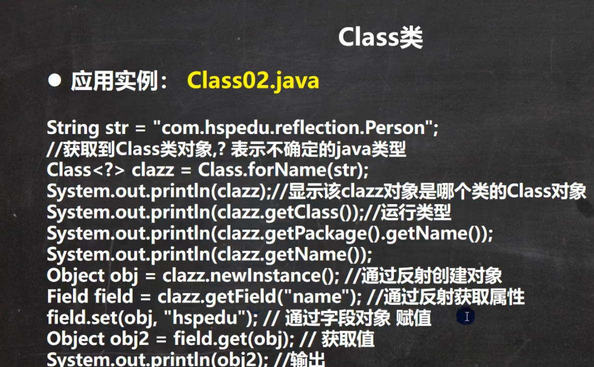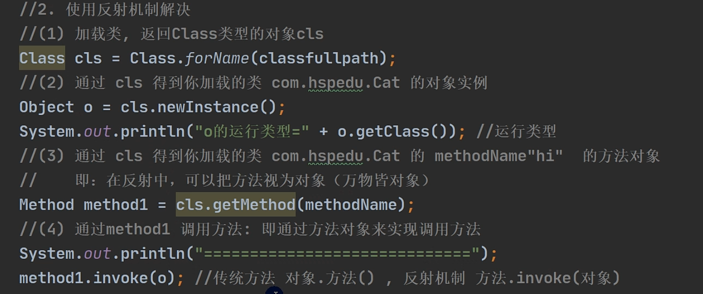 public class fs { public static void main(String[] args) throws IOException, ClassNotFoundException, InstantiationException, IllegalAccessException, NoSuchMethodException, InvocationTargetException, NoSuchFieldException { //使用Properties类,可以读写配置文件 //不使用new Cat创建一个对象 Properties properties = new Properties(); properties.load(new FileInputStream("src\\re.properties")); String classpath = properties.get("classpath").toString(); String method = properties.get("method").toString(); //不能实现,classpath,method是String类型 //使用反射机制解决 //返回一个class类型对象 Class<?> cls = Class.forName(classpath); Object o = cls.newInstance(); Method method1 = cls.getMethod(method); //方法.invoke(对象); 调用类的方法 method1.invoke(o); //得到属性字段(只能的得到公用的属性) Field name = cls.getField("name"); //传统方法 对象.成员变量,反射机制 成员变量对象.get(对象); System.out.println(name.get(o)); //Constructor代表构造方法,Constructor对象表示构造起 Constructor<?> constructor = cls.getConstructor(); System.out.println(constructor); //得到一个有参构造器 Constructor<?> constructor1 = cls.getConstructor(String.class); System.out.println(constructor1); //类的常用方法 //得到是哪一个类 System.out.println(cls);//class jd.Cat //得到包名 System.out.println(cls.getPackage().getName()); //得到全类名 System.out.println(cls.getName()); //通过cls创建一个对象实例 Object o1 = cls.newInstance(); Cat cat = (Cat)o1; System.out.println(cat.name); System.out.println(cat); //得到类的属性 Field name1 = cls.getField("name"); System.out.println(name1.get(cat)); //给属性赋值 name.set(cat,"狗"); System.out.println(name1.get(cat)); //得到所有的所属性 Field[] fields = cls.getFields(); for (Field field : fields) { System.out.println(field); } //获取Class类的方法 //编译阶段 Class<?> cls2 = Class.forName(classpath); System.out.println(cls2); //加载阶段 Class<Cat> cls3 = Cat.class; System.out.println(cls3); //运行阶段 Cat cat1 = new Cat(); Class<? extends Cat> cls4 = cat1.getClass(); System.out.println(cls4); //类加载器 ClassLoader classLoader = cat.getClass().getClassLoader(); Class<?> cls5 = classLoader.loadClass(classpath); System.out.println(cls5); //cls cls1 cls2 cls3是同一个类 //获得私有的属性 Field[] declaredFields = cls.getDeclaredFields(); for (Field declaredField : declaredFields) { System.out.println(declaredField.getName()); } //反射爆破创建实例 //如果无参构造器创建实例 Object o2 = cls.newInstance(); System.out.println(o2); //通过public的有参构造器创建实例 Constructor<?> constructor2 = cls.getConstructor(String.class); Object mqs = constructor2.newInstance("mqs"); System.out.println(mqs); //通过非public有参构造器创建实例 Constructor<?> declaredConstructor = cls.getDeclaredConstructor(String.class, int.class); declaredConstructor.setAccessible(true); Object mqs1 = declaredConstructor.newInstance("mq", 23); System.out.println(mqs1); //通过反射访问类中的成员 Object o3 = cls.newInstance(); System.out.println(o3.getClass());//运行类型 Field name2 = cls.getField("name"); name2.set(o3,"mm"); System.out.println(name2.get(o3)); //还有其他方法略 //通过反射访问方法(方法同样也可以爆破) Object o4 = cls.newInstance();//是一个cat对象 Method hi = cls.getMethod("hi"); Method hi1 = cls.getDeclaredMethod("hi"); hi.invoke(o4); //反射访问私有方法 Method hi2 = cls.getDeclaredMethod("say",String.class); hi2.setAccessible(true); Object kl = hi2.invoke(o4, "kl"); System.out.println(kl); } }