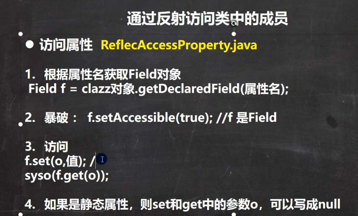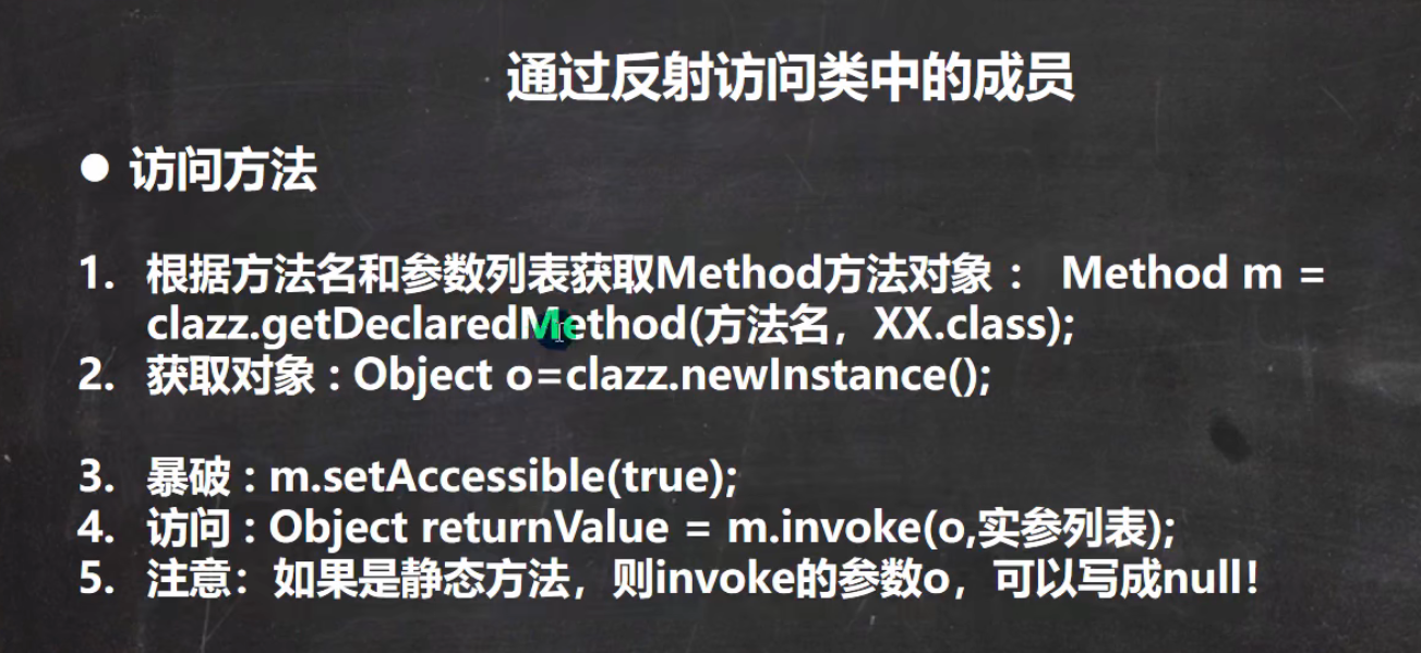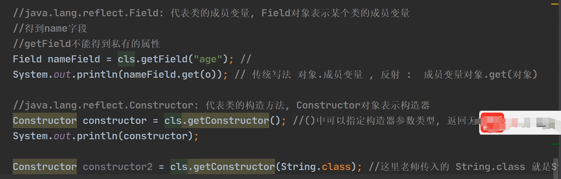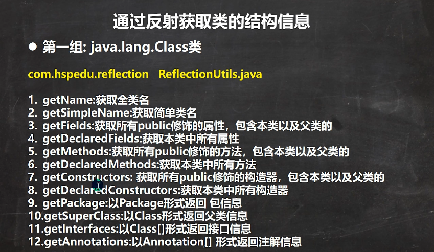 public class fs { public static void main(String[] args) throws IOException, ClassNotFoundException, InstantiationException, IllegalAccessException, NoSuchMethodException, InvocationTargetException, NoSuchFieldException { //使用Properties类,可以读写配置文件 //不使用new Cat创建一个对象 Properties properties = new Properties(); properties.load(new FileInputStream("src\\re.properties")); String classpath = properties.get("classpath").toString(); String method = properties.get("method").toString(); //不能实现,classpath,method是String类型 //使用反射机制解决 //返回一个class类型对象 Class<?> cls = Class.forName(classpath); Object o = cls.newInstance(); Method method1 = cls.getMethod(method); //方法.invoke(对象); 调用类的方法 method1.invoke(o); //得到属性字段(只能的得到公用的属性) Field name = cls.getField("name"); //传统方法 对象.成员变量,反射机制 成员变量对象.get(对象); System.out.println(name.get(o)); //Constructor代表构造方法,Constructor对象表示构造起 Constructor<?> constructor = cls.getConstructor(); System.out.println(constructor); //得到一个有参构造器 Constructor<?> constructor1 = cls.getConstructor(String.class); System.out.println(constructor1); //类的常用方法 //得到是哪一个类 System.out.println(cls);//class jd.Cat //得到包名 System.out.println(cls.getPackage().getName()); //得到全类名 System.out.println(cls.getName()); //通过cls创建一个对象实例 Object o1 = cls.newInstance(); Cat cat = (Cat)o1; System.out.println(cat.name); System.out.println(cat); //得到类的属性 Field name1 = cls.getField("name"); System.out.println(name1.get(cat)); //给属性赋值 name.set(cat,"狗"); System.out.println(name1.get(cat)); //得到所有的所属性 Field[] fields = cls.getFields(); for (Field field : fields) { System.out.println(field); } //获取Class类的方法 //编译阶段 Class<?> cls2 = Class.forName(classpath); System.out.println(cls2); //加载阶段 Class<Cat> cls3 = Cat.class; System.out.println(cls3); //运行阶段 Cat cat1 = new Cat(); Class<? extends Cat> cls4 = cat1.getClass(); System.out.println(cls4); //类加载器 ClassLoader classLoader = cat.getClass().getClassLoader(); Class<?> cls5 = classLoader.loadClass(classpath); System.out.println(cls5); //cls cls1 cls2 cls3是同一个类 //获得私有的属性 Field[] declaredFields = cls.getDeclaredFields(); for (Field declaredField : declaredFields) { System.out.println(declaredField.getName()); } //反射爆破创建实例 //如果无参构造器创建实例 Object o2 = cls.newInstance(); System.out.println(o2); //通过public的有参构造器创建实例 Constructor<?> constructor2 = cls.getConstructor(String.class); Object mqs = constructor2.newInstance("mqs"); System.out.println(mqs); //通过非public有参构造器创建实例 Constructor<?> declaredConstructor = cls.getDeclaredConstructor(String.class, int.class); declaredConstructor.setAccessible(true); Object mqs1 = declaredConstructor.newInstance("mq", 23); System.out.println(mqs1); //通过反射访问类中的成员 Object o3 = cls.newInstance(); System.out.println(o3.getClass());//运行类型 Field name2 = cls.getField("name"); name2.set(o3,"mm"); System.out.println(name2.get(o3)); //还有其他方法略 //通过反射访问方法(方法同样也可以爆破) Object o4 = cls.newInstance();//是一个cat对象 Method hi = cls.getMethod("hi"); Method hi1 = cls.getDeclaredMethod("hi"); hi.invoke(o4); //反射访问私有方法 Method hi2 = cls.getDeclaredMethod("say",String.class); hi2.setAccessible(true); Object kl = hi2.invoke(o4, "kl"); System.out.println(kl); } }