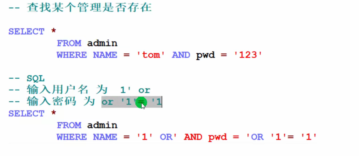 public class PreparedStatement { @SuppressWarnings({"all"}) public static void main(String[] args) throws Exception{ Properties properties = new Properties(); properties.load(new FileInputStream("src\\mysql.properties")); String user = properties.getProperty("user"); String pwd = properties.getProperty("password"); String driver = properties.getProperty("driver"); String url = properties.getProperty("url"); Class.forName(driver); Connection connection = DriverManager.getConnection(url, user, pwd); //测试连接是否成功 System.out.println(connection); //程序中用户输入的密码 int pwd1 = 0; String name = ""; //sql语句 String sql = "select name .pwd from admin where name = ? and pwd = ?"; //实现preparedStatement接口 java.sql.PreparedStatement preparedStatement = connection.prepareStatement(sql); //赋值 preparedStatement.setString(1,name); preparedStatement.setString(2,pwd); //执行 ResultSet resultSet = preparedStatement.executeQuery(); if (resultSet.next()){ System.out.println("登录成功"); }else { System.out.println("登录失败"); } } }
