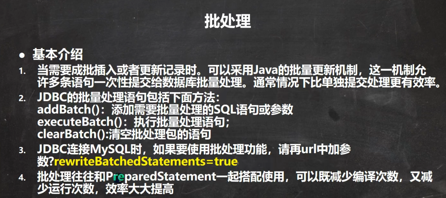 public class batch { public static void main(String[] args) { } public void batch() throws Exception { Connection connection = JDBCUtils.getConnection(); String sql = "insert into admi2 values(null,?,?"; PreparedStatement preparedStatement = connection.prepareStatement(sql); System.out.println("开始执行"); for (int i=0;i<5000;i++){ preparedStatement.setString(1,"mqs"+i); preparedStatement.setString(2,"666"); //将sql语批量加入 preparedStatement.addBatch(); //批量执行 if (i+1%1000==0) { preparedStatement.executeBatch(); preparedStatement.clearBatch(); } } JDBCUtils.close(null,preparedStatement,connection); } }